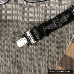 Đồng hồ nam SRWATCH SG8874.4101 với thiết kế mặt số tròn, kim số và chỉ giờ cách điệu trên nền mặt số đen nổi bật, vỏ kim loại màu trắng bạc cùng dây da có vân tạo vẻ nổi bật và sang trọng.