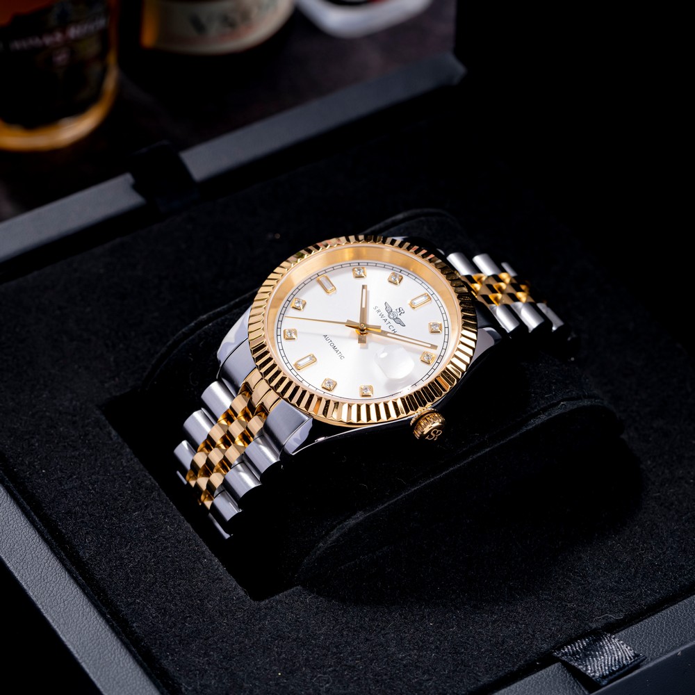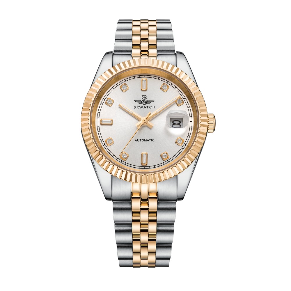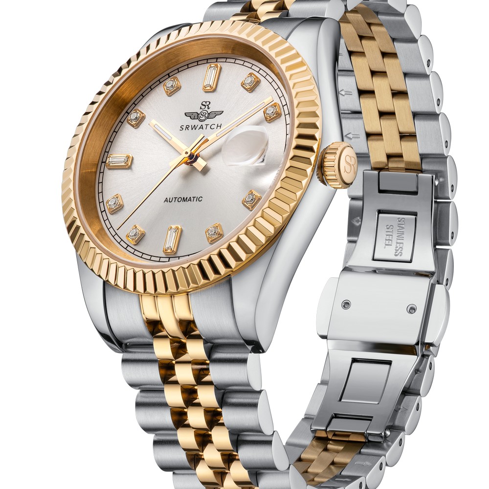 Đồng hồ nam SRWATCH SG88805.1202AT với mặt tròn, vỏ đồng hồ phối hai tông màu vàng trắng, các vạch chỉ giờ đính đá sang trọng cùng ba kim màu vàng nổi bật trên nền mặt số màu trắng hài hòa với các cọc số màu vàng sang trọng. Vỏ đồng hồ được kết hợp với dây đeo bằng thép không gỉ, thiết kế độc đáo và được phủ lớp mạ PVD hai tông màu vàng trắng. Đây là mẫu đồng hồ tự động (automatic), trang bị mặt kính sapphire chống trầy xước, lịch ngày tiện dụng vị trí 3 giờ và khả năng chống nước 5ATM, mang lại sự yên tâm cho người dùng khi sử dụng hằng ngày.