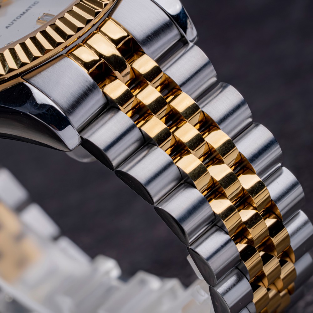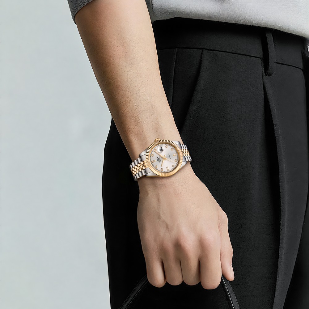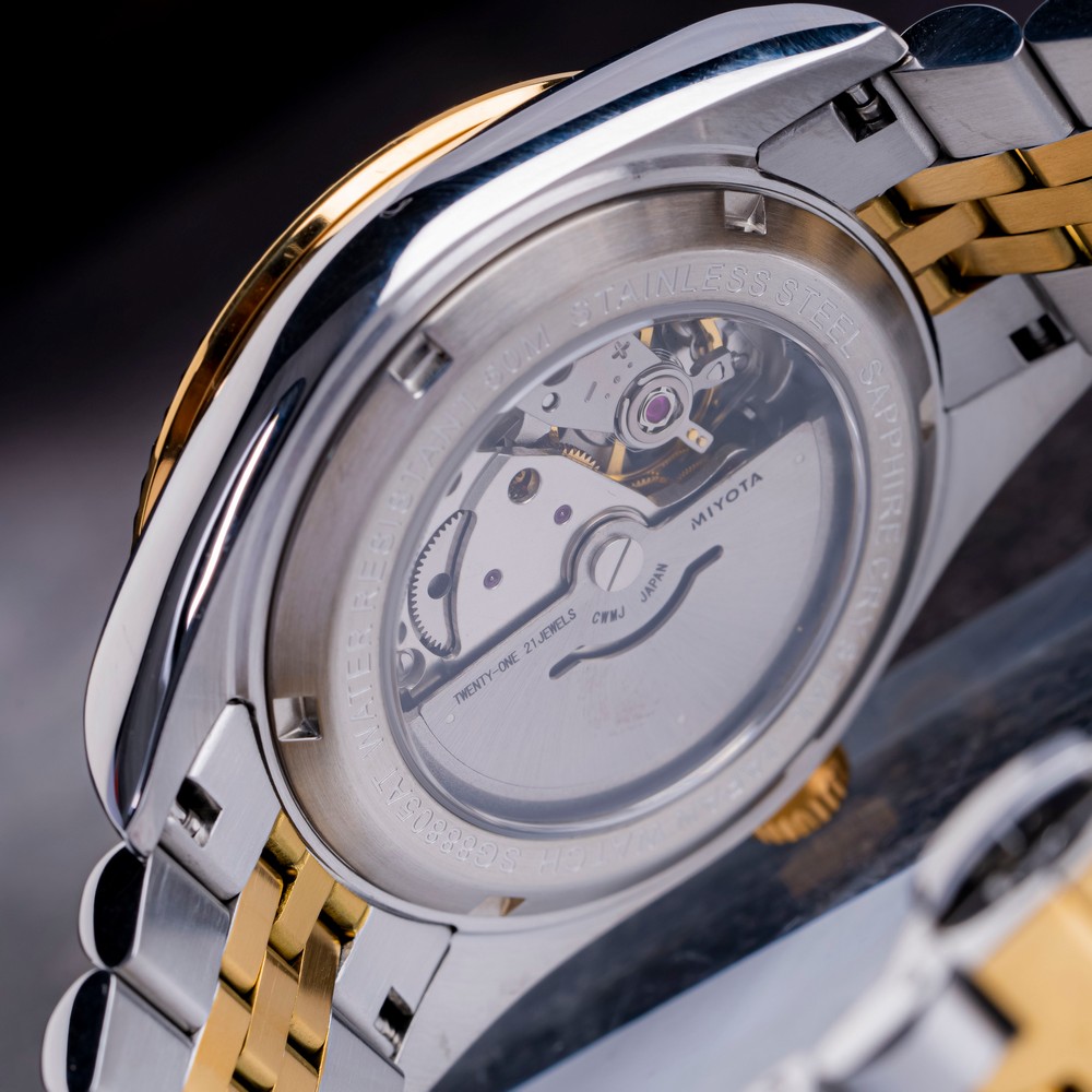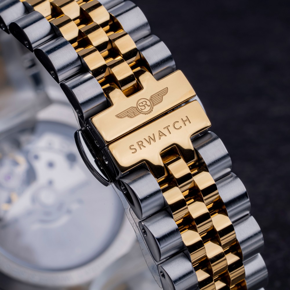 Đồng hồ nam SRWATCH SG88805.1202AT với mặt tròn, vỏ đồng hồ phối hai tông màu vàng trắng, các vạch chỉ giờ đính đá sang trọng cùng ba kim màu vàng nổi bật trên nền mặt số màu trắng hài hòa với các cọc số màu vàng sang trọng. Vỏ đồng hồ được kết hợp với dây đeo bằng thép không gỉ, thiết kế độc đáo và được phủ lớp mạ PVD hai tông màu vàng trắng. Đây là mẫu đồng hồ tự động (automatic), trang bị mặt kính sapphire chống trầy xước, lịch ngày tiện dụng vị trí 3 giờ và khả năng chống nước 5ATM, mang lại sự yên tâm cho người dùng khi sử dụng hằng ngày.