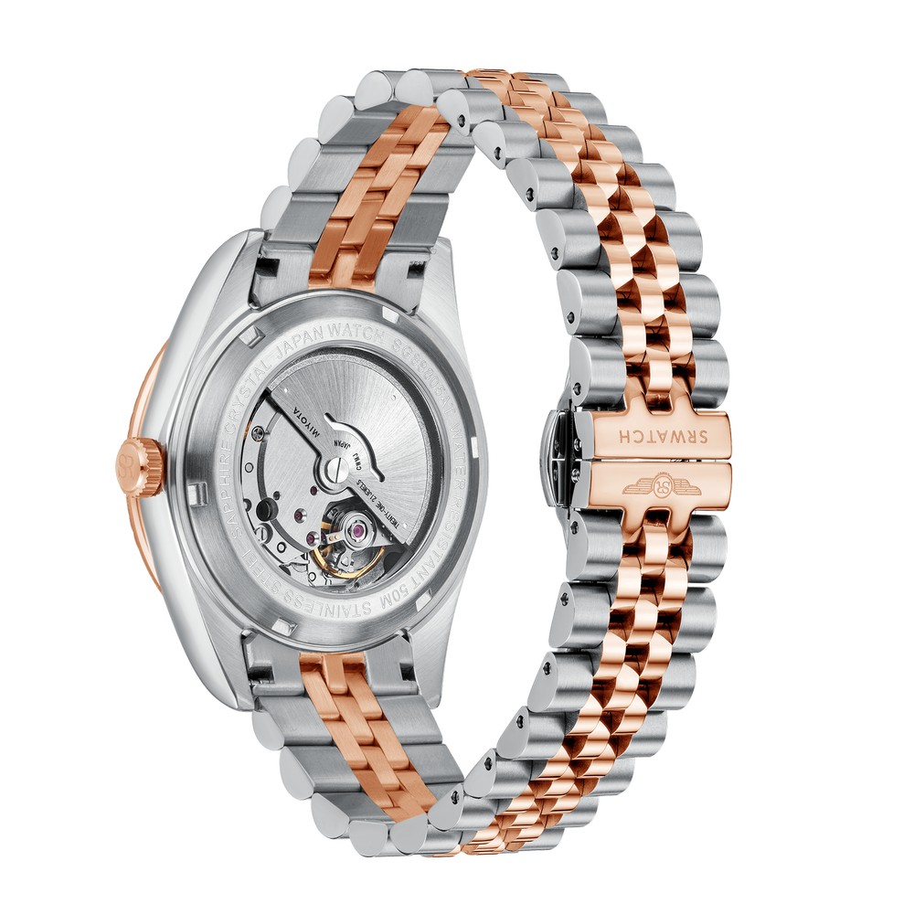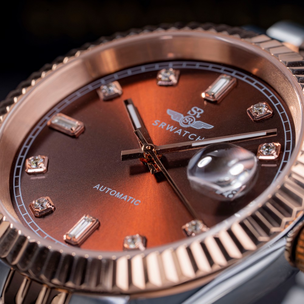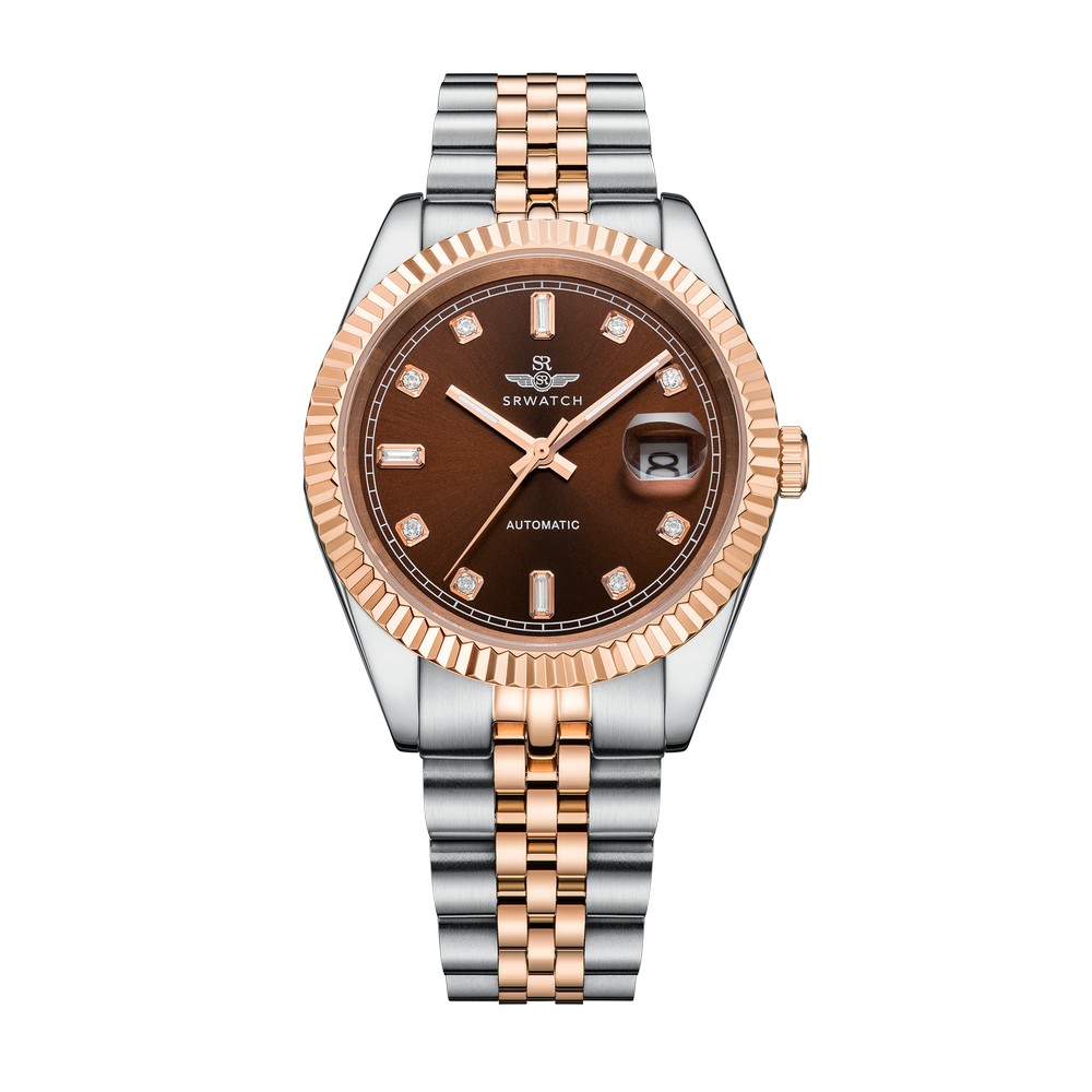 Đồng hồ nam SRWATCH SG88805.1205AT với mặt tròn, vỏ đồng hồ phối hai màu vàng hồng và trắng, cọc số đính đá sang trọng cùng ba kim màu vàng hài hòa trên nền mặt số màu nâu với các cọc số vàng sang trọng. Vỏ đồng hồ kết hợp với dây đeo bằng thép không gỉ, được mạ PVD hai màu vàng hồng và trắng. Đây là mẫu đồng hồ automatic (tự động), trang bị mặt kính sapphire chống trầy xước, lịch ngày tiện dụng vị trí 3 giờ. và khả năng chống nước 5ATM, mang lại sự yên tâm cho người dùng.