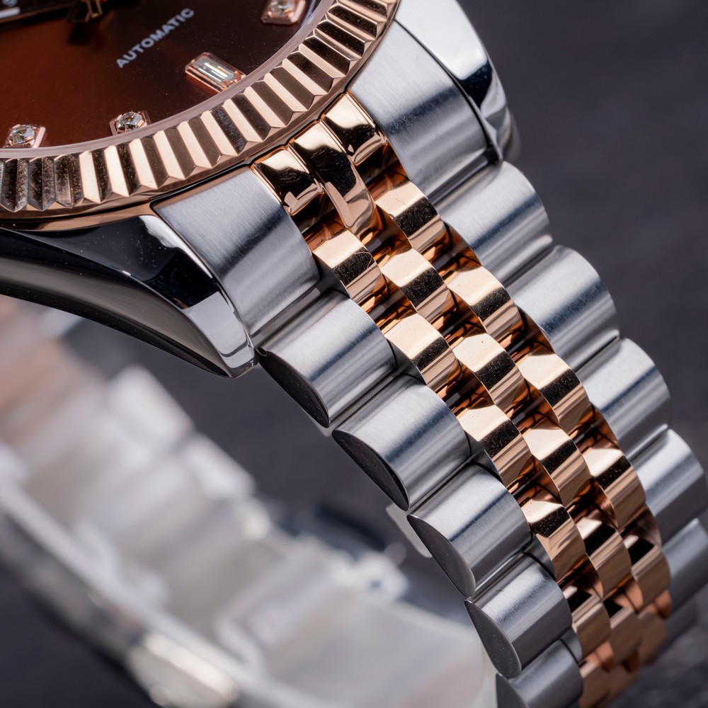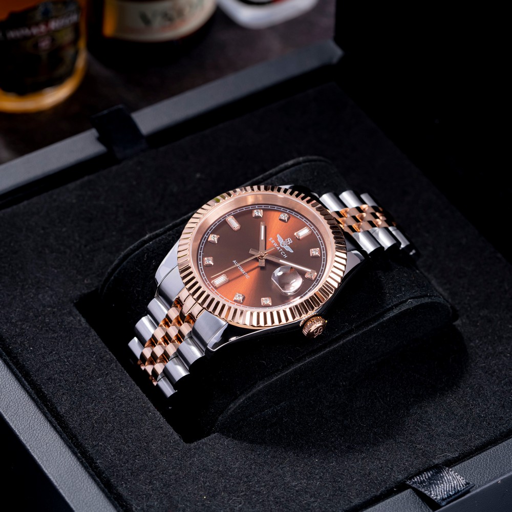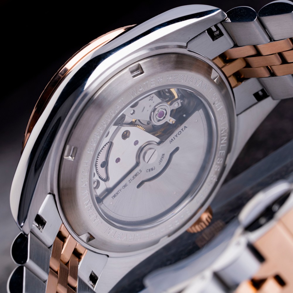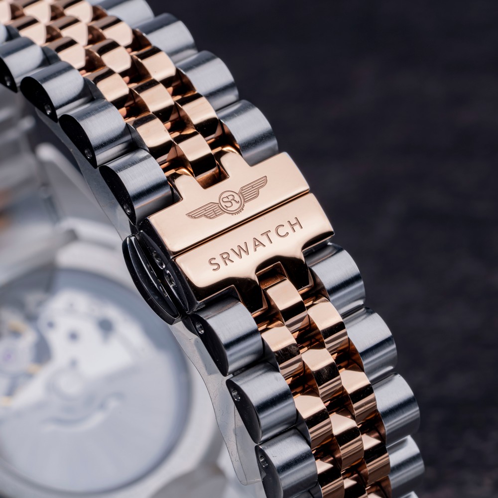 Đồng hồ nam SRWATCH SG88805.1205AT với mặt tròn, vỏ đồng hồ phối hai màu vàng hồng và trắng, cọc số đính đá sang trọng cùng ba kim màu vàng hài hòa trên nền mặt số màu nâu với các cọc số vàng sang trọng. Vỏ đồng hồ kết hợp với dây đeo bằng thép không gỉ, được mạ PVD hai màu vàng hồng và trắng. Đây là mẫu đồng hồ automatic (tự động), trang bị mặt kính sapphire chống trầy xước, lịch ngày tiện dụng vị trí 3 giờ. và khả năng chống nước 5ATM, mang lại sự yên tâm cho người dùng.