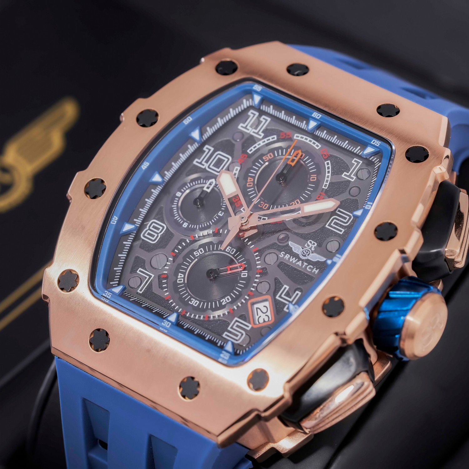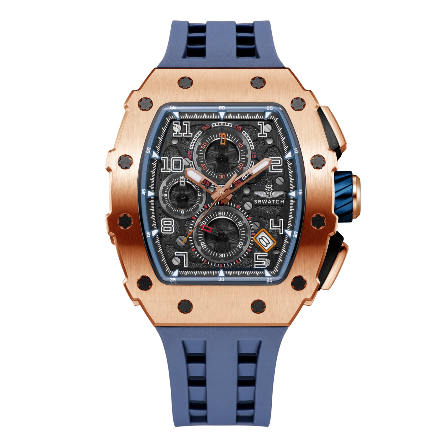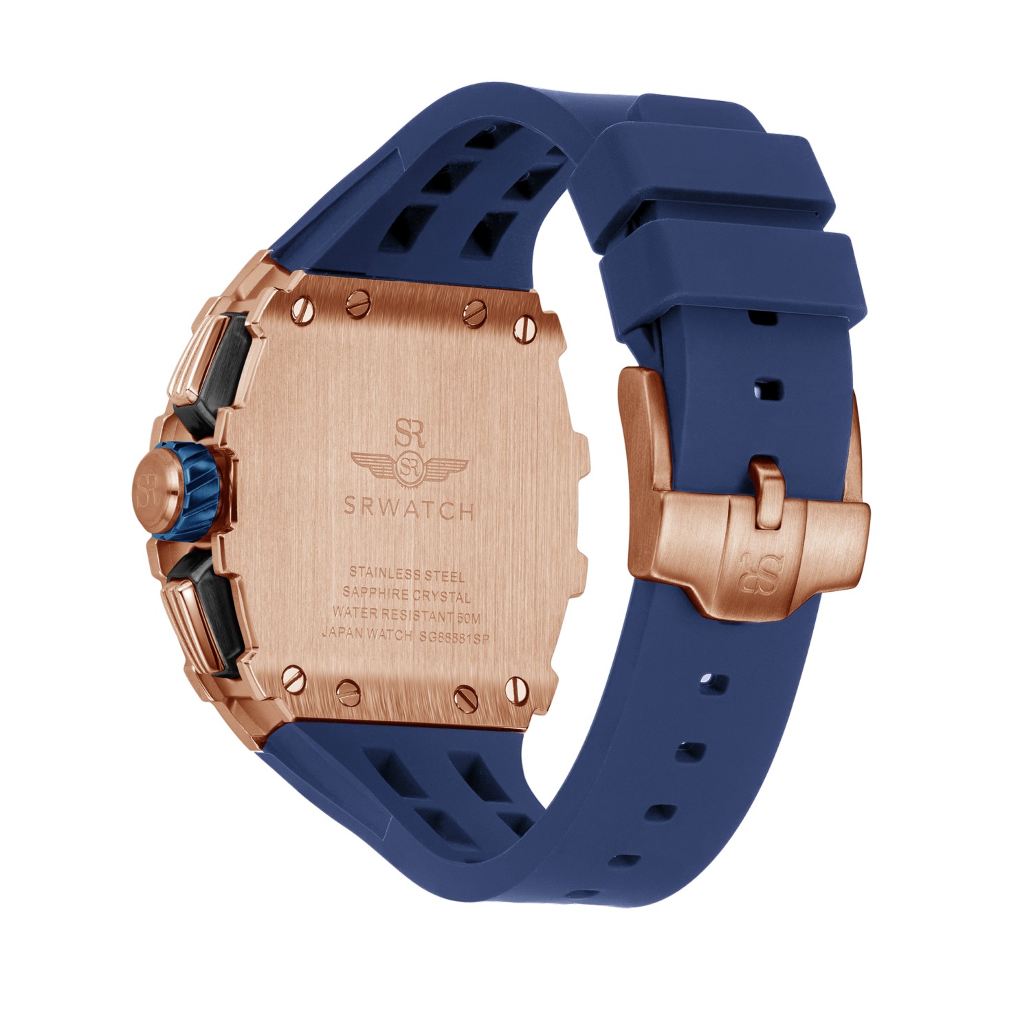 Đồng hồ nam SRWATCH SG88881.4903SP mặt đồng hồ thiết kế thể thao hiện đại. Vỏ đồng hồ được mạ vàng Công Nghệ PVD, gia công tỉ mỉ với các điểm nhấn là ốc hình sao 6 cạnh bao quanh mặt với độ hoàn thiện cao tạo nên sự mạnh mẽ. Dây đeo bằng cao su co giản tạo sự thoả mái. Đồng hồ có 3 kim chính cơ bản hiện thị giờ, phút, giấy. Đồng hồ có chức năng chronograph (giờ, phút, giây) thể thao thể hiện bằng 3 mặt đồng hồ nhỏ trung tâm. Kèm theo cửa sổ lịch ngày thuận tiện cho việc sử dụng. Mặt kính sapphire chống xước cao cấp, đạt tiêu chuẩn chống nước 5ATM, đảm bảo sự an tâm cho người đeo.